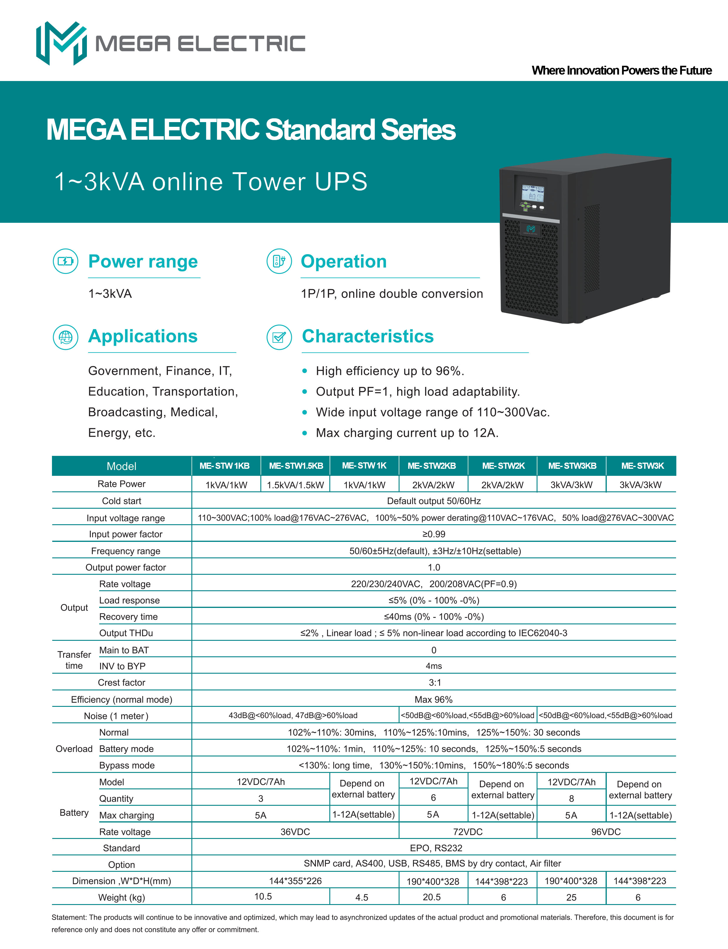 یو پی اسهای ME-STW3K و ME-STW3KB از نسل جدید سیستمهای تأمین توان بیوقفه برند MEGA Electric هستند که با فناوری DSP پیشرفته و طراحی صنعتی دقیق، ترکیبی از کارایی، اطمینان و انعطافپذیری ارائه میدهند.